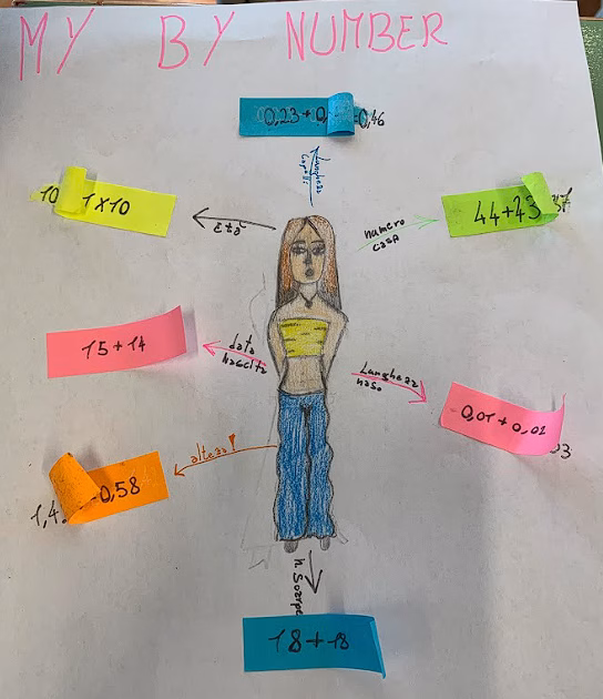 In classe quinta gli alunni hanno svolto un esercizio originale e coinvolgente: ogni bambino ha disegnato sé stesso al centro di un foglio e, tutto attorno, ha inserito informazioni personali espresse solo attraverso i numeri. Un modo creativo per raccontarsi, scoprendo che i numeri possono parlare di noi e che l’uguale è un ponte che unisce ciò che siamo alle quantità che ci rappresentano: equilibrio, armonia, relazione.
