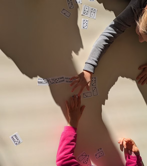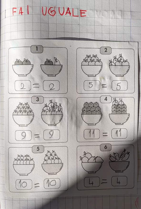 Successivamente gli alunni hanno affrontato una scheda operativa con uguaglianze mancanti. Il compito era capire quali elementi aggiungere per rendere i due gruppi equivalenti. Un vero esercizio di logica, che ha permesso ai bambini di scoprire che “uguale” significa stessa quantità. Prima si è ragionato insieme, poi ciascuno ha sperimentato in autonomia. Per concludere la mattinata in modo divertente e significativo, la classe ha giocato con le tessere del domino. In un primo momento i bambini hanno collaborato, confrontandosi nella scelta delle tessere corrette; in un secondo momento si sono messi alla prova individualmente, verificando le competenze appena acquisite. Un’attività che ha unito il piacere del gioco alla pratica delle equivalenze.