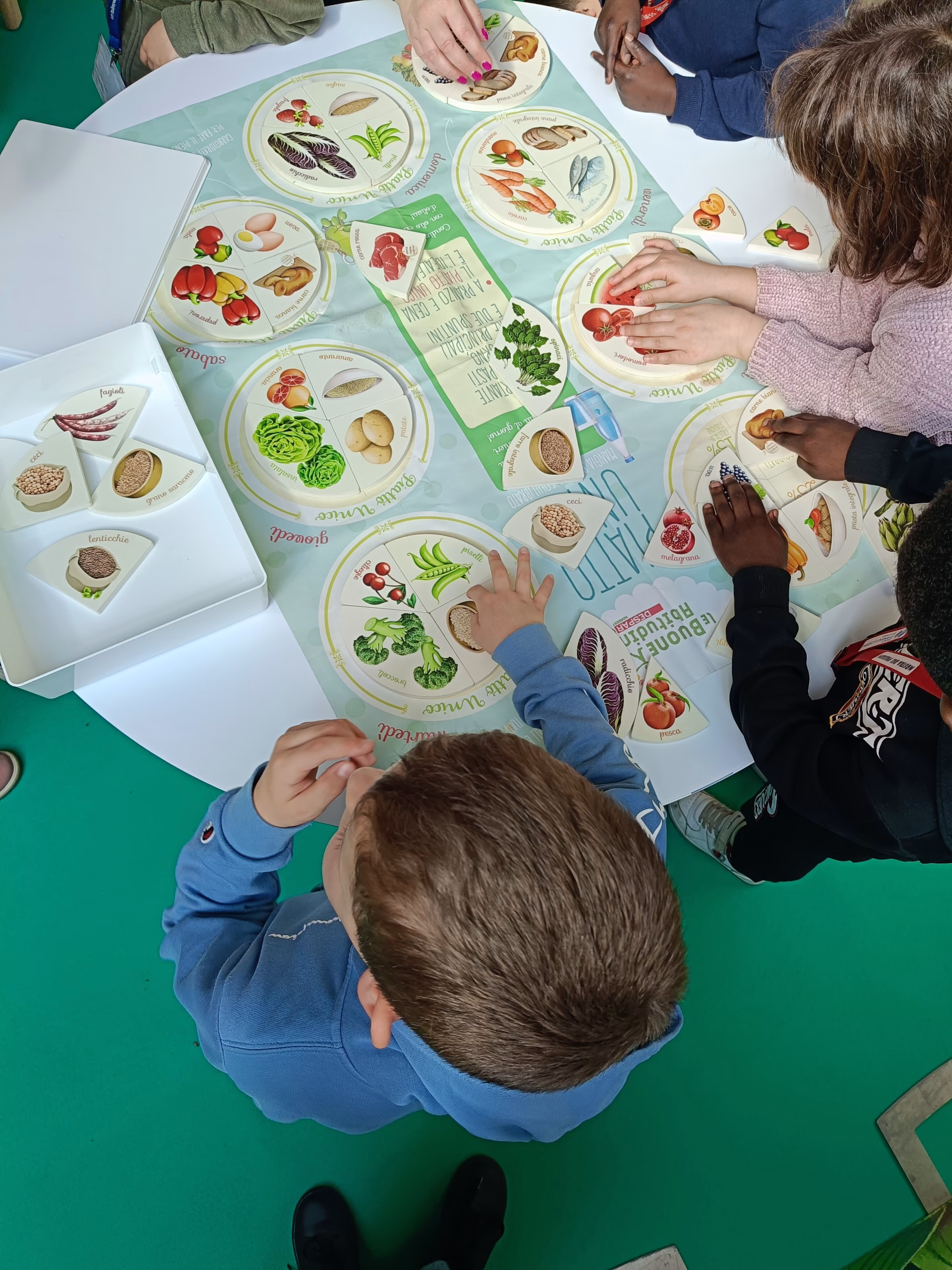 In particolare, il laboratorio si è concentrato sulla scoperta della piramide alimentare e del “piatto del mangiar sano”. I bambini, chiamati a completare una grande piramide con alimenti magnetici, hanno riflettuto sulla frequenza con cui è corretto consumare i diversi cibi, confrontandosi anche sulle proprie abitudini alimentari. Successivamente, attraverso attività pratiche di gruppo, hanno sperimentato come comporre un pasto equilibrato, comprendendo l’importanza di una dieta varia e bilanciata.