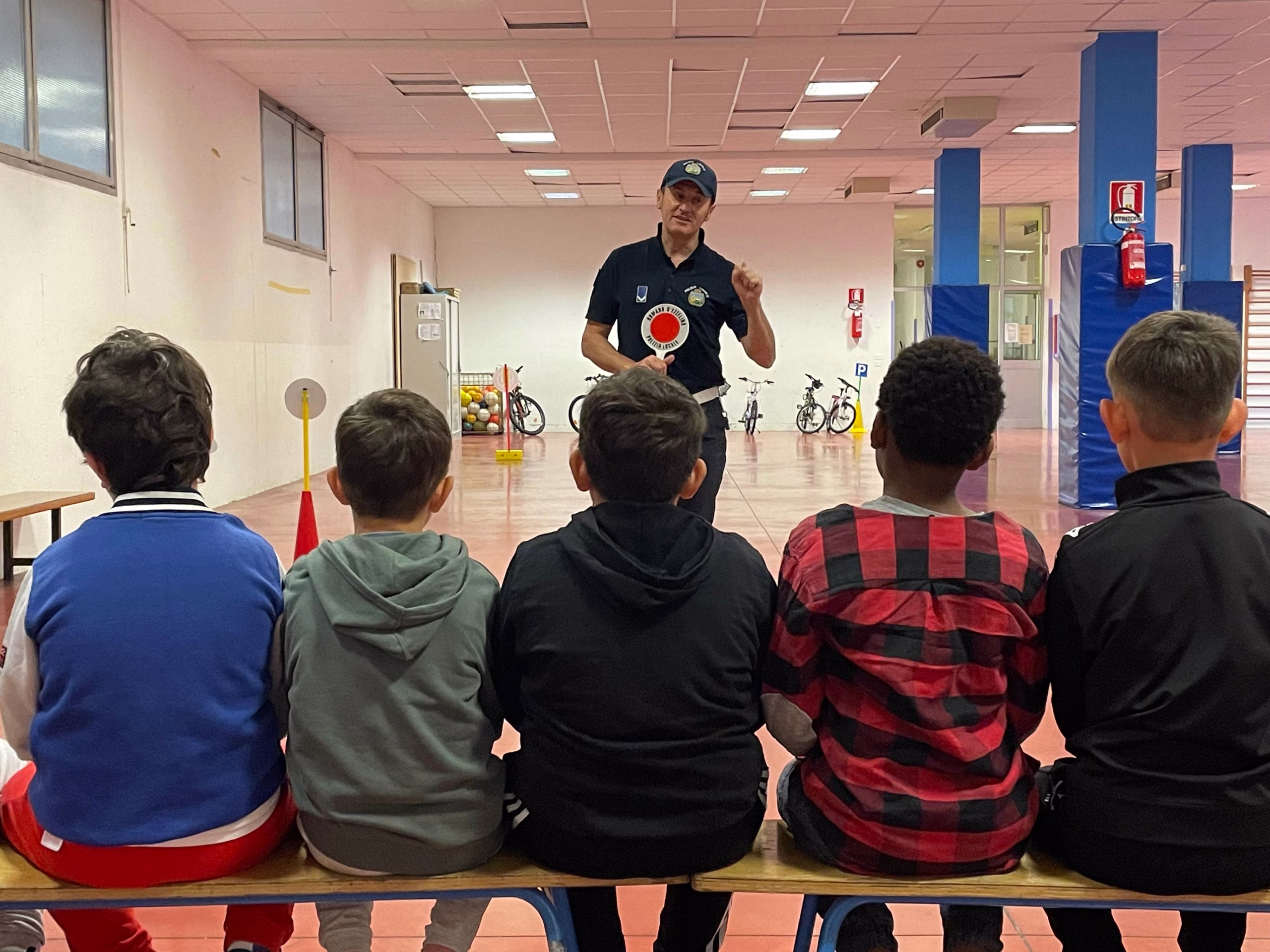 Il progetto ha preso il via con un primo incontro condotto dal vigile del Comune, che ha incontrato i bambini direttamente in aula. Durante l’incontro, il vigile ha illustrato in modo chiaro e coinvolgente le principali norme del codice della strada, l’uso corretto del marciapiede, l’attraversamento pedonale e il significato dei segnali più comuni. I bambini hanno potuto fare domande, raccontare le loro esperienze e imparare attraverso esempi pratici vicini alla loro quotidianità. Il secondo incontro si è svolto all’aperto con una parte pratica: