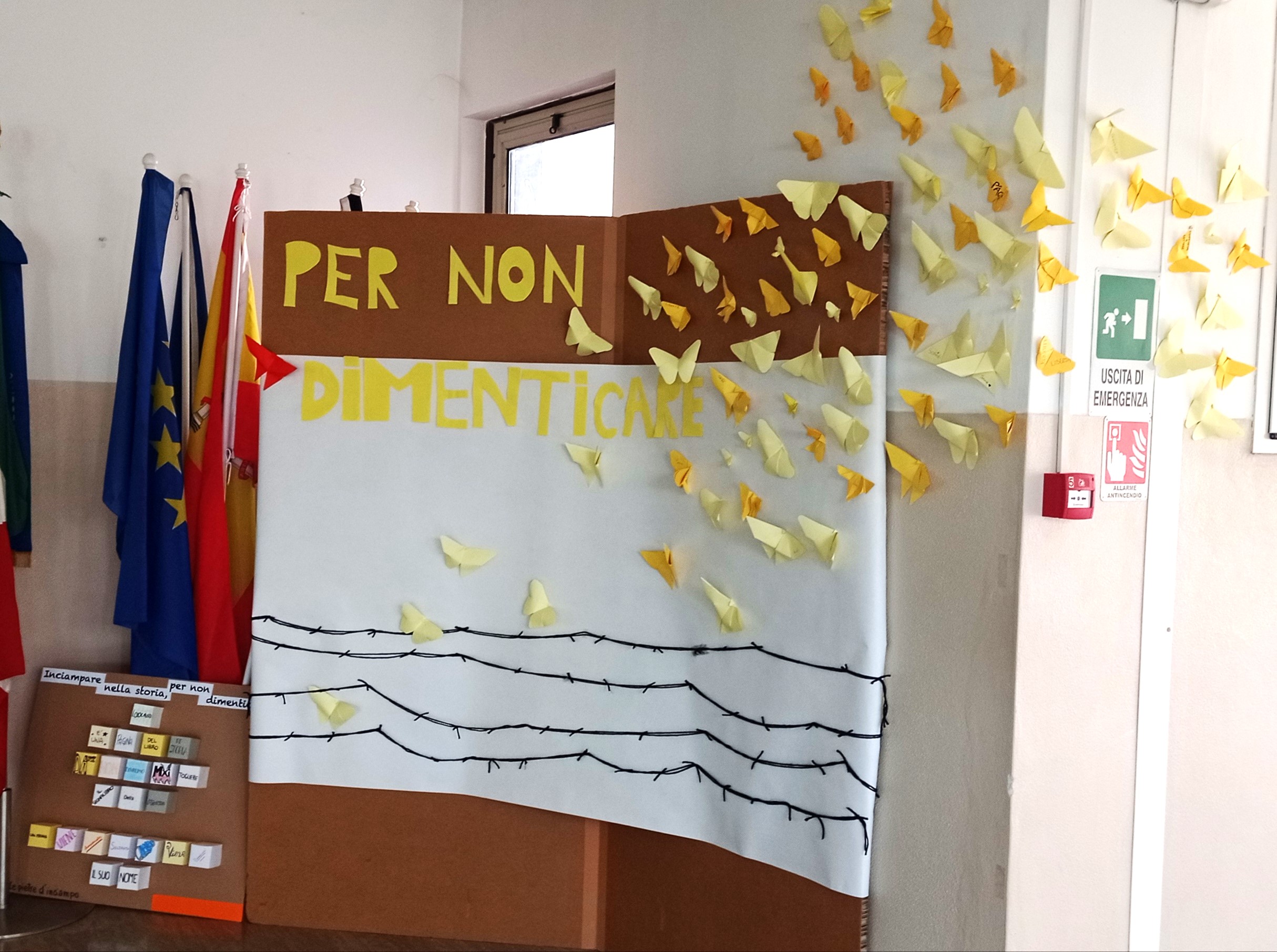 Gli alunni hanno realizzato, su un pannello di cartone che è stato collocato nell’atrio della scuola, il simbolo della libertà, valore imprescindibile di ogni essere umano. L’attività ha previsto: lettere ritagliate di carta gialla per comporre le parole “Per non dimenticare”; fili di lana nera per imitare il filo spinato; realizzazione con la tecnica dell’origami, di tante farfalle gialle di dimensioni diverse per indicare persone adulte e bambini.