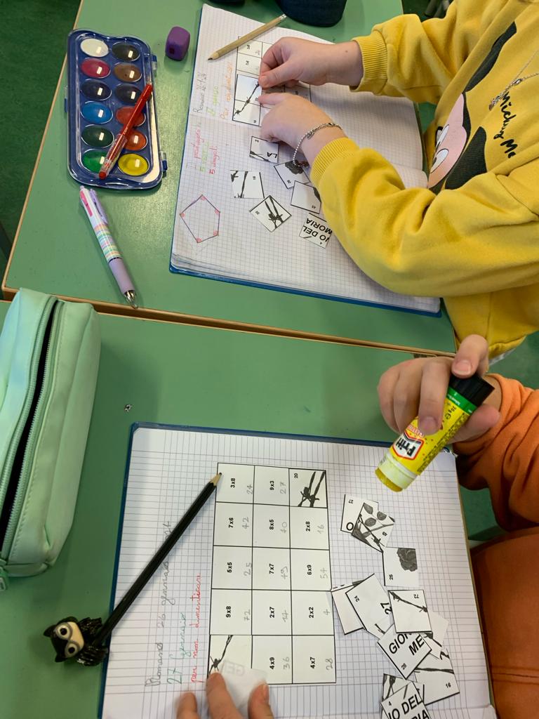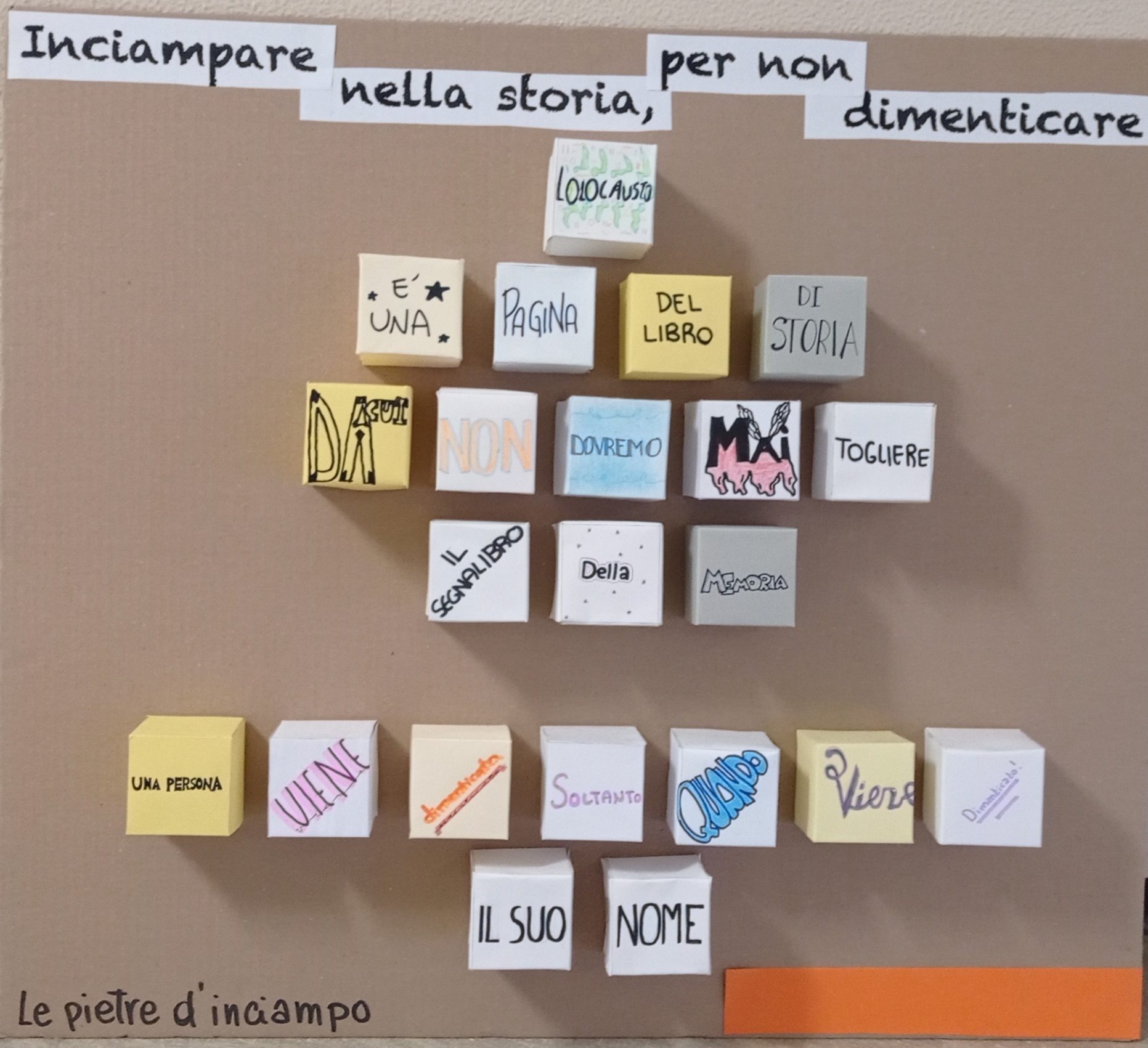 Una classe ha trasformato il cubo, argomento di una lezione di geometria, in pietra d’inciampo: su un pannello di cartone di forma quadrata i ragazzi hanno posto il titolo “Inciampare nella storia per non dimenticare”; ognuno ha realizzato un cubo e su una faccia, ha scritto una parola. I cubi che sono stati incollati sul pannello secondo un certo ordine, compongono la frase: “L’olocausto è una pagina del libro di storia da cui non dovremo mai togliere il segnalibro della memoria. Una persona viene dimenticata soltanto quando viene dimenticato il suo nome”.