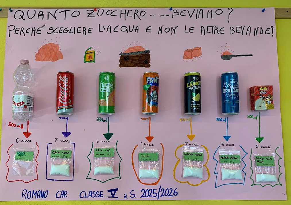 L’attività ha suscitato sorpresa e riflessione: i bambini hanno compreso che molte bevande contengono grandi quantità di zucchero “nascosto” e che l’acqua rappresenta la scelta più sana per l’idratazione quotidiana.
