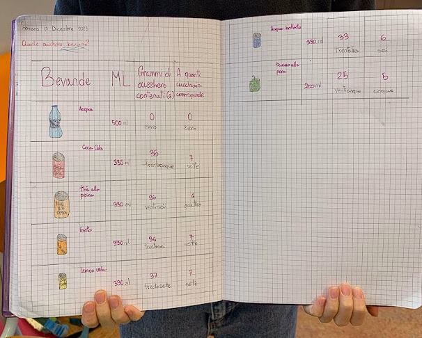 Dopo aver osservato la piramide dell’idratazione e imparato a leggere le etichette nutrizionali, la classe è stata divisa in gruppi. A ciascun gruppo è stata assegnata una bevanda di uso comune (bibite gassate, tè freddo, succhi di frutta e acqua) e il compito di individuare la quantità di zucchero contenuta. Utilizzando una bilancia e lo zucchero semolato, gli alunni hanno riprodotto visivamente i grammi di zucchero presenti in ogni bevanda, confrontandoli con il bicchiere vuoto dell’acqua.
