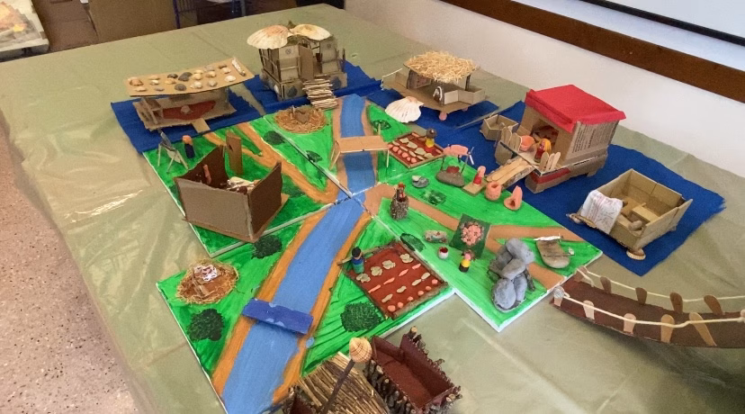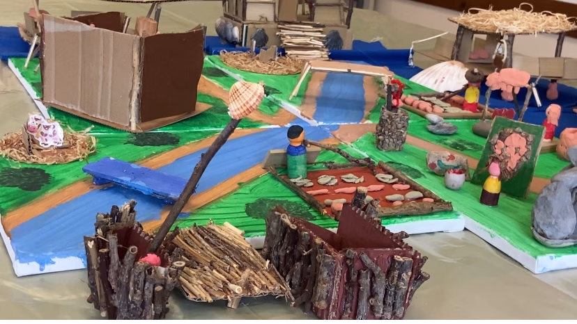 Con materiali naturali (sassi, bastoni, foglie, paglia, conchiglie…) e di riciclo, gli alunni hanno progettato e costruito un modellino di villaggio Neolitico, mettendo in pratica competenze manuali, artistiche e collaborative.