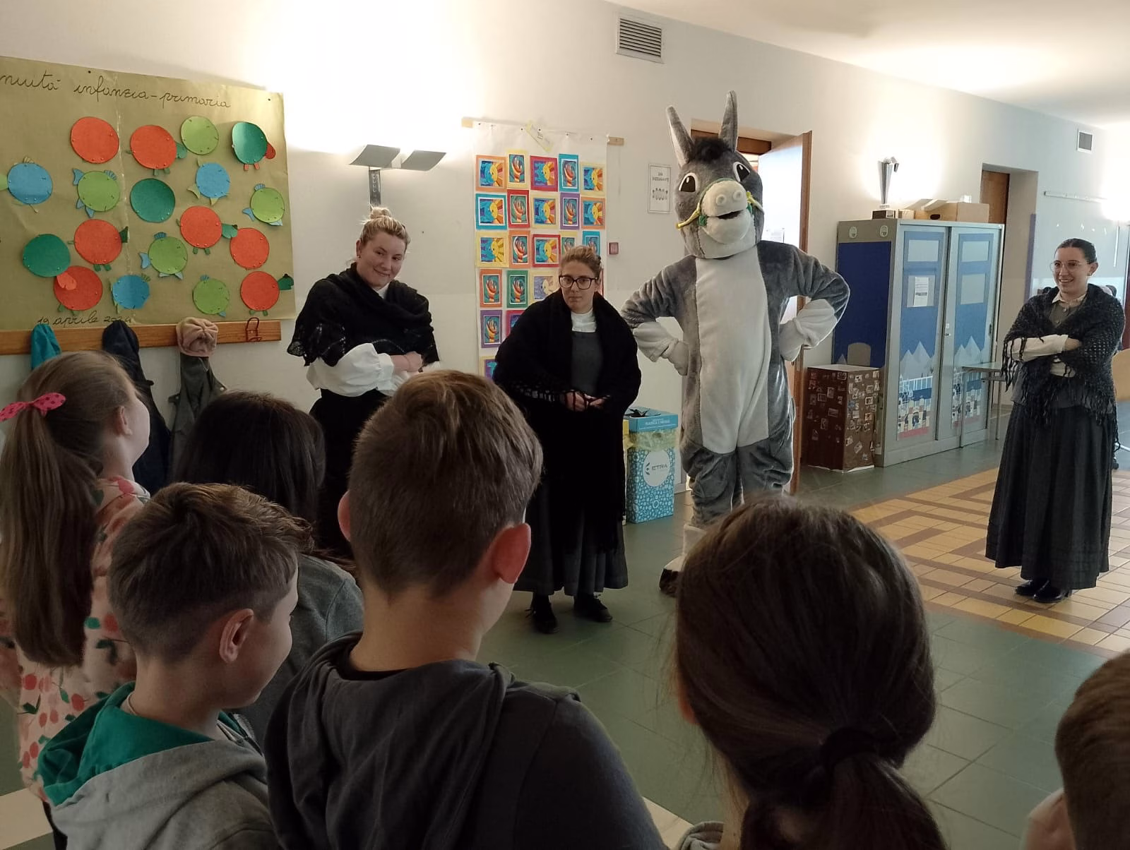 In Contra’ Molinetto i bambini hanno trascorso una mattinata ricca e coinvolgente, dove un gruppo di volontari, vestiti con gli abiti di un tempo, hanno accolto con il sorriso alunni e insegnanti. Con loro i bambini hanno sperimentato i giochi di una volta: un “flipper” di legno, il lancio dei cerchi, il lancio dei tappi. Il divertimento è stato davvero tanto! Terminati i giochi, i bambini hanno potuto osservare un alveare didattico, hanno trovato l’ape regina, toccato la cera, le arnie, hanno assaggiato il polline. Il mondo delle api è veramente affascinante e ha suscitato tante curiosità. Gli apicoltori di lunga esperienza erano davvero felici di rispondere alle domande dei piccoli ed è stato bello vedere il passaggio di conoscenze tra generazioni diverse, come pure stare in mezzo al verde, sentire le oche starnazzanti, avvicinarsi ai muli, osservare lo stagno zeppo di girini, una rana sgattaiolare veloce sul fondo e per ultimo un germano reale. Per concludere l’esperienza i bambini hanno ricevuto un sacchettino di biscotti a forma di animaletto.